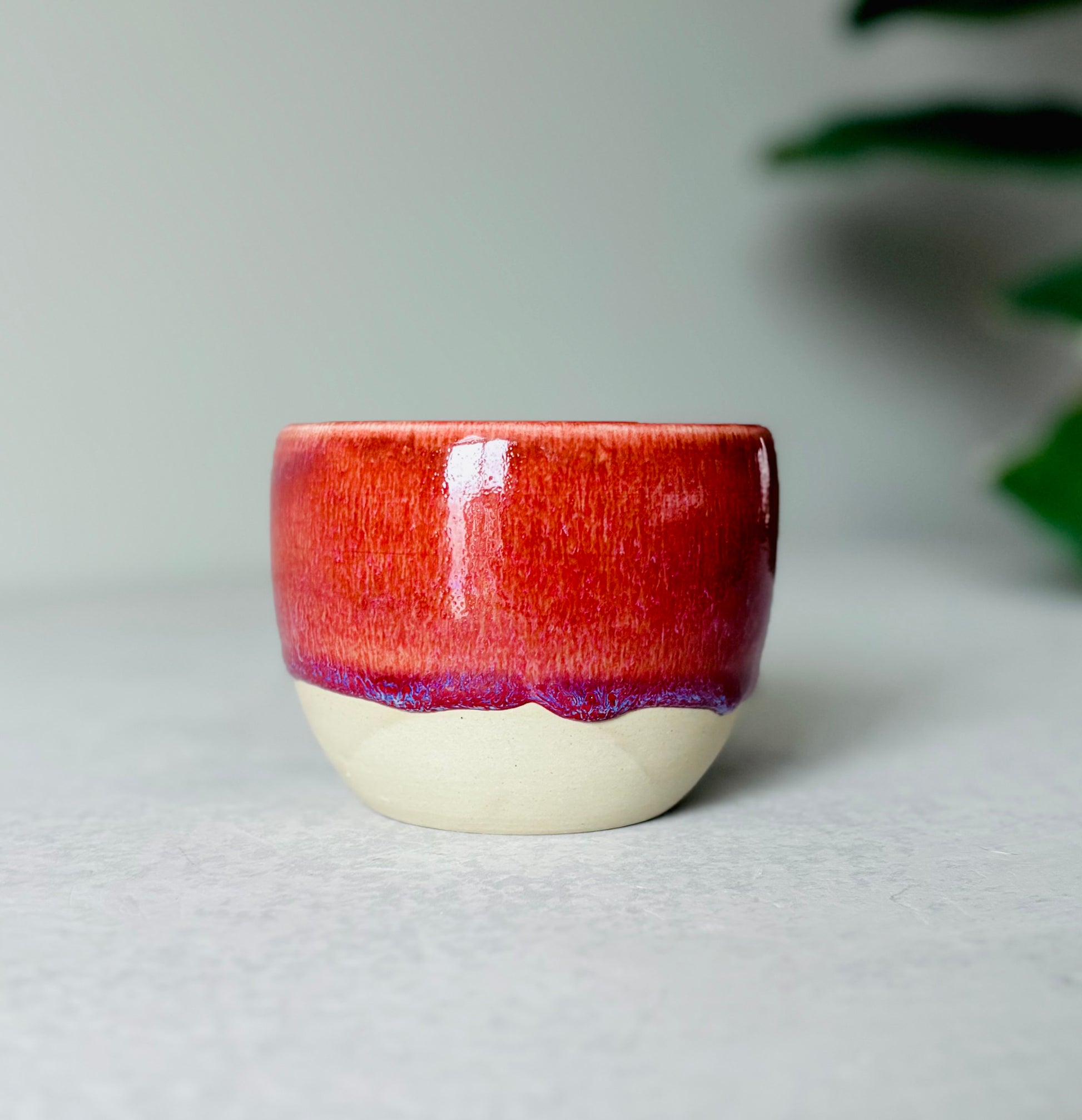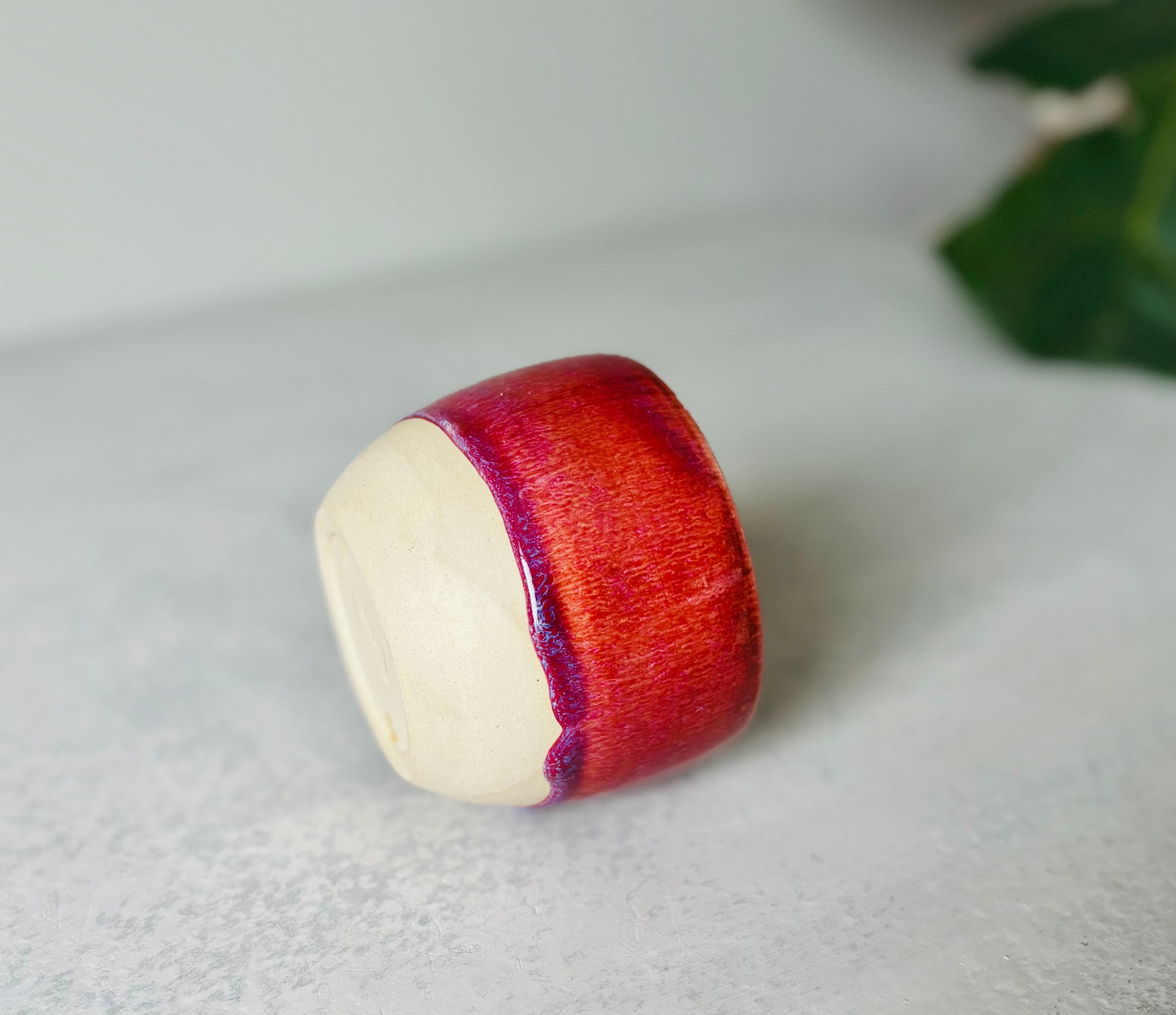 This is a wheel thrown mug made out of an off-white stoneware and glazed in a semi-transparent gloss crimson which pools nicely midway down the mug creating a thicker glaze line which has slight floating purple accents.