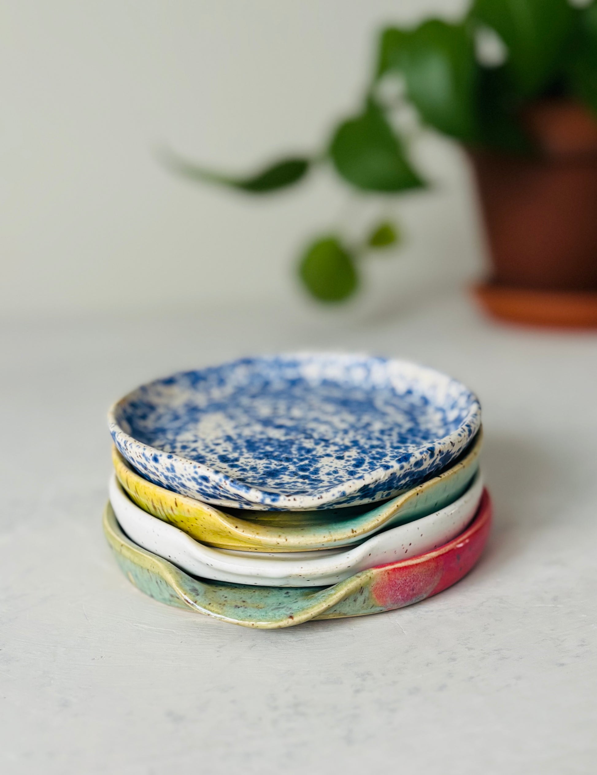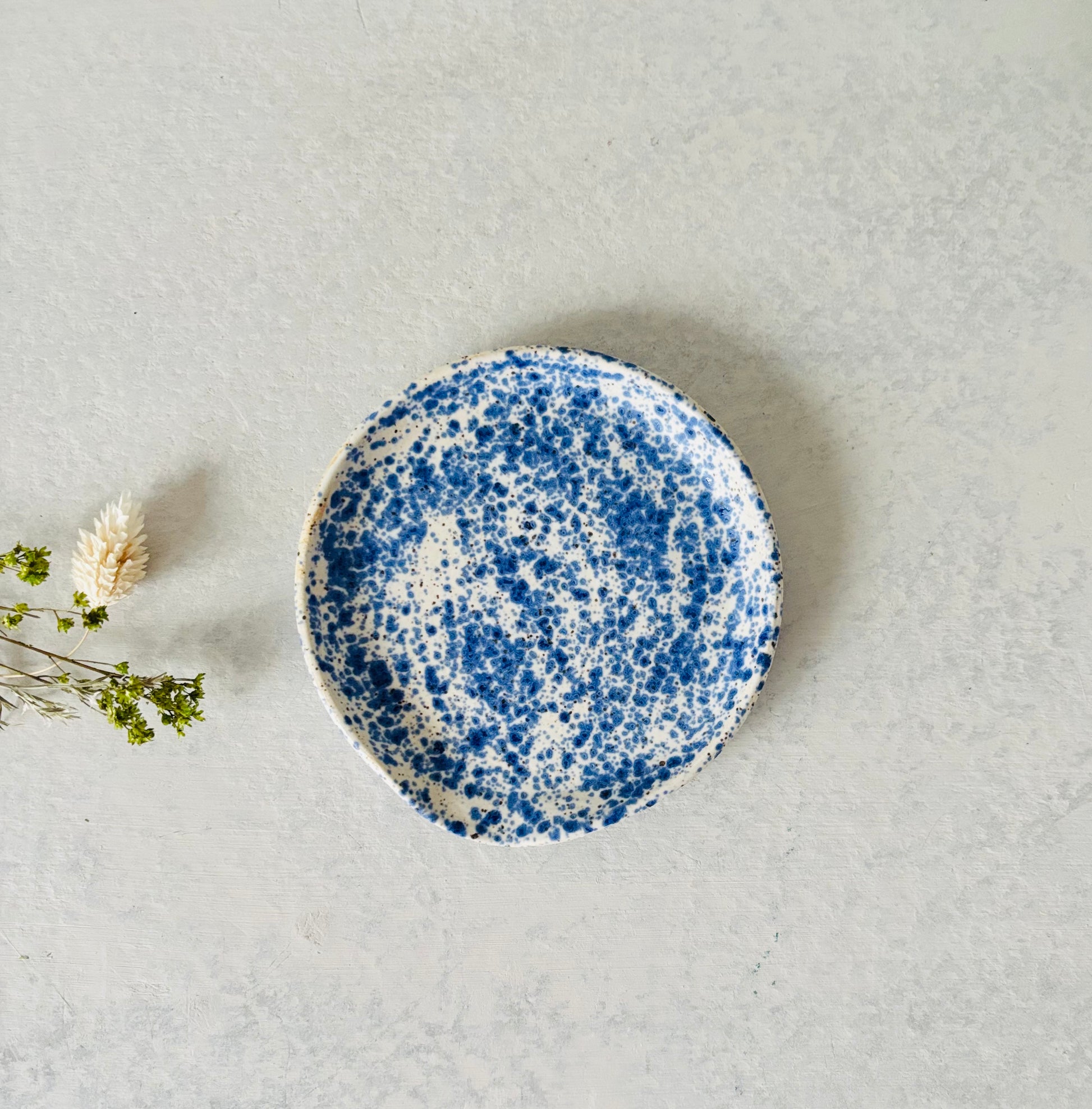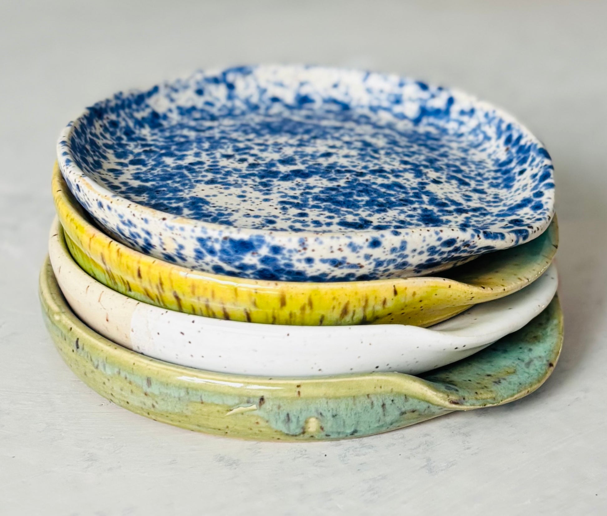 This is a wheel thrown spoon rest made out of an off white speckled stoneware and glazed in "Grandmas Glaze”, a beautiful blue splatterware.