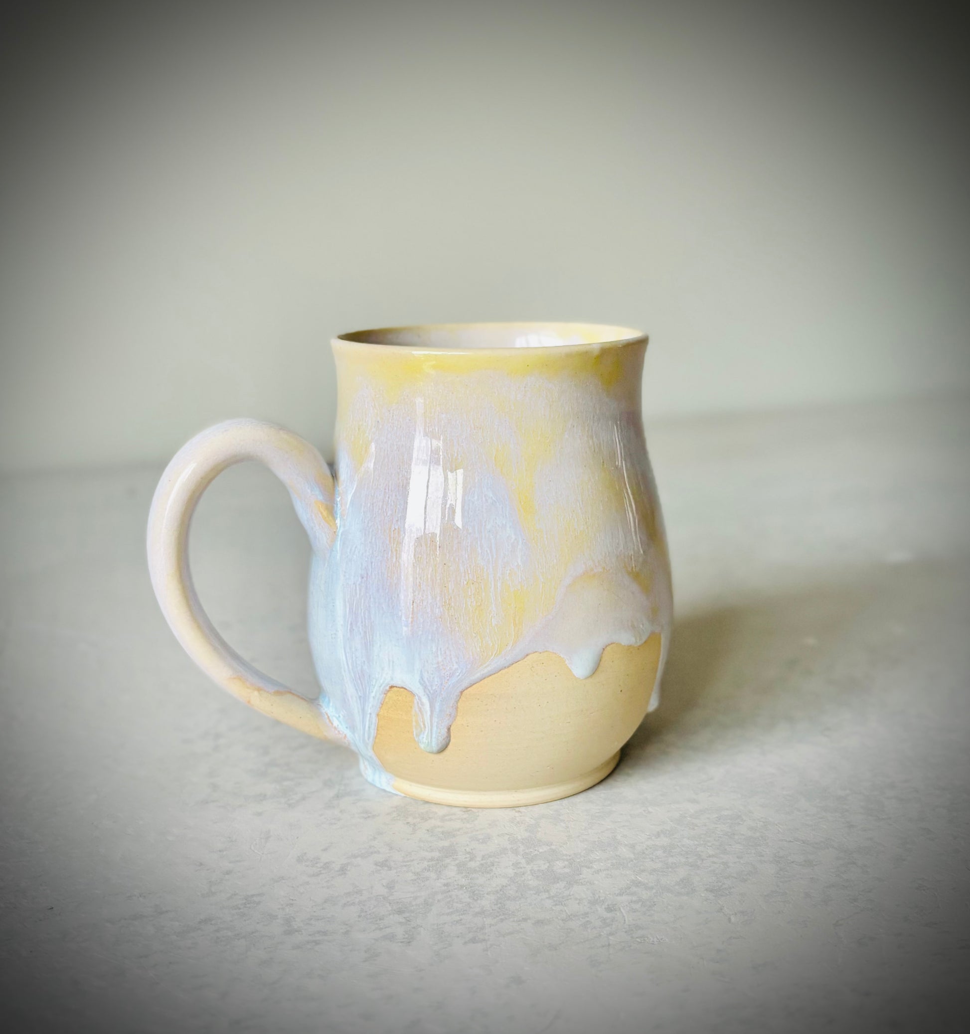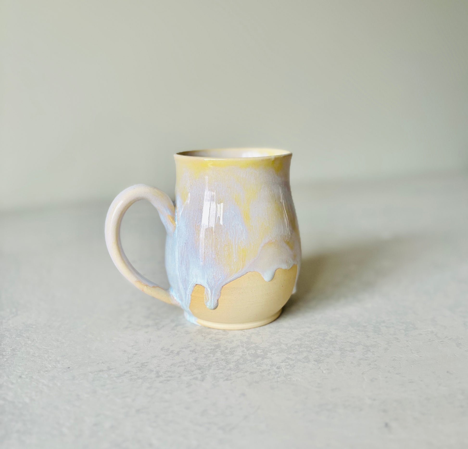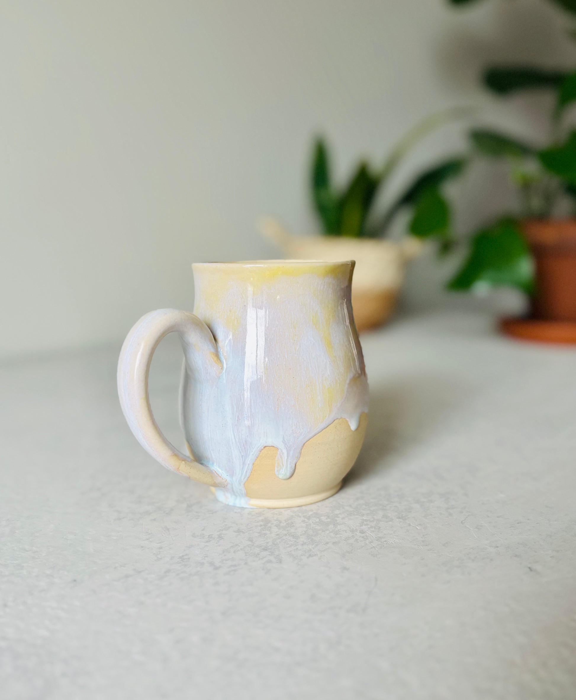 This is a wheel thrown mug made out of an off-white stoneware and glazed in a gorgeous floating pearly white that fades into a soft pastel yellow with pronounced drips.