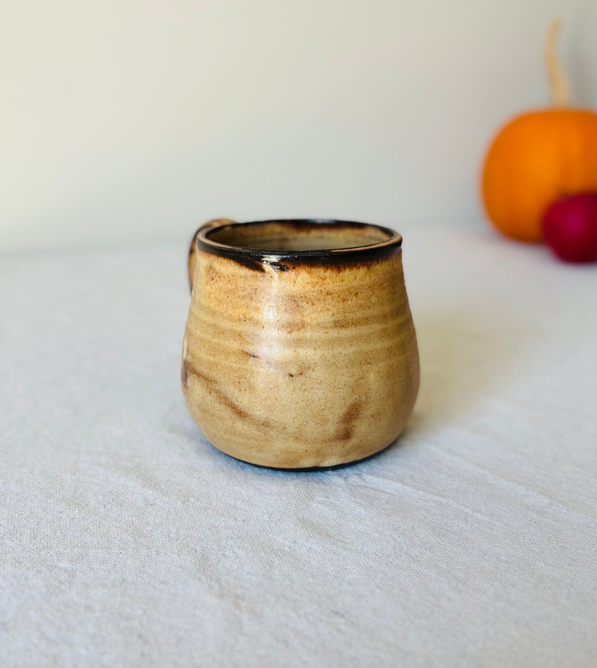 This is a wheel thrown mug made out of a black stoneware and glazed in a matte ginger glaze.
