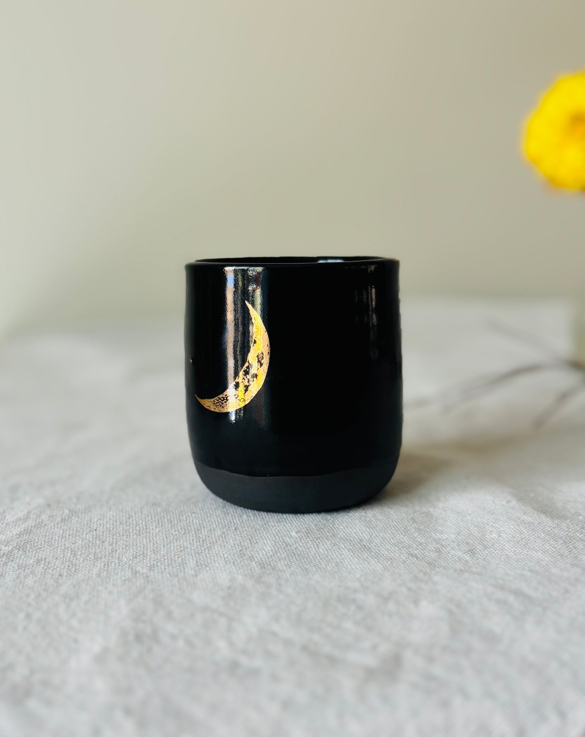 This is a wheel thrown tumbler made out of a clack porcelain and glazed in a gloss black. A 22k gold decal of a crescent moon was attached to the mug and re-fired to a low temperature to ensure the decal is permanent.