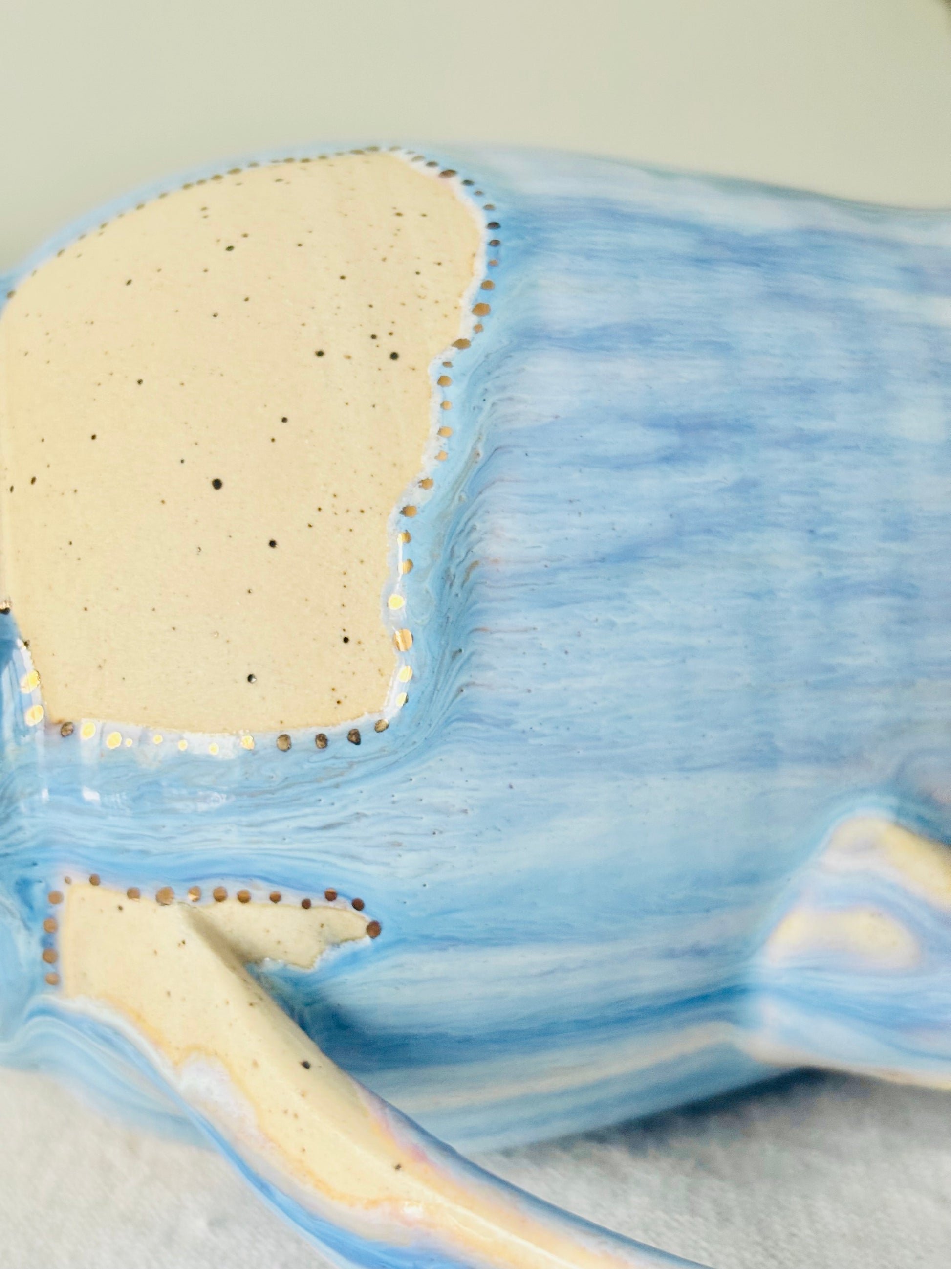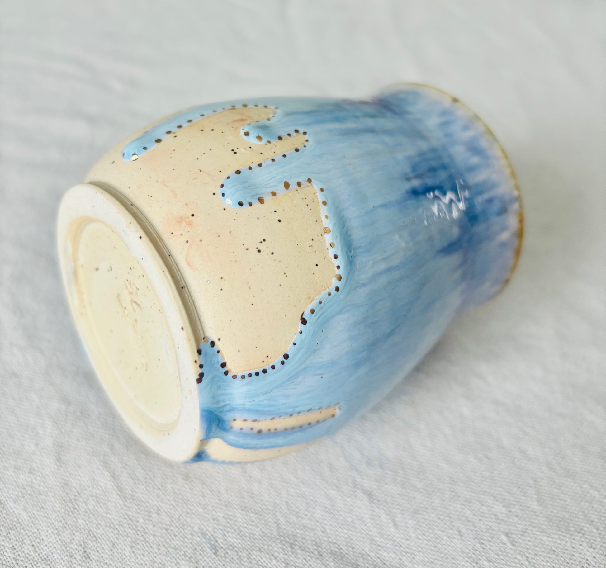 This is a wheel thrown mug made out of an off-white speckled stoneware and glazed in a gorgeous powder blue with hues of darker blues throughout and 22k gold dots hand painted around the glaze line.