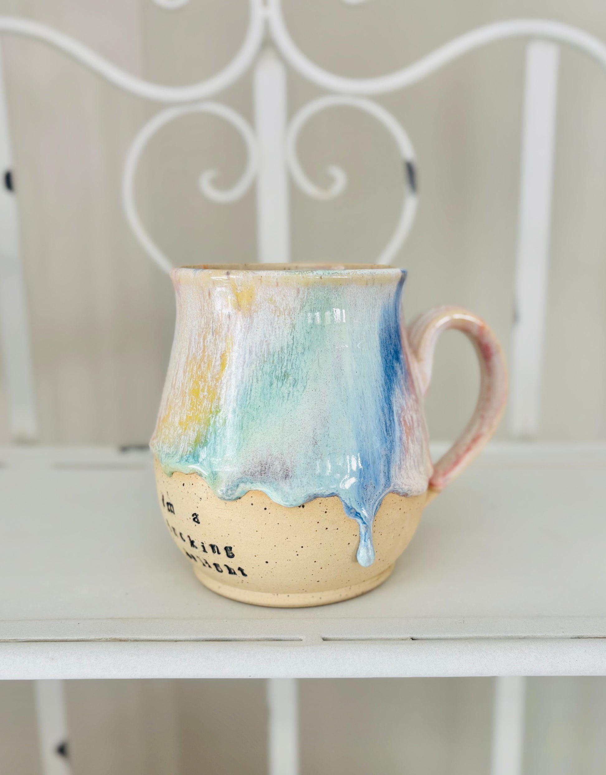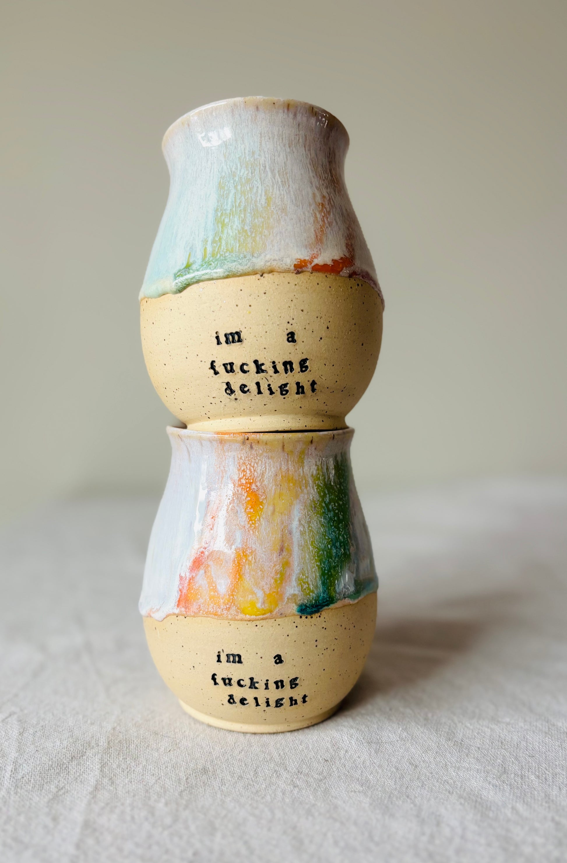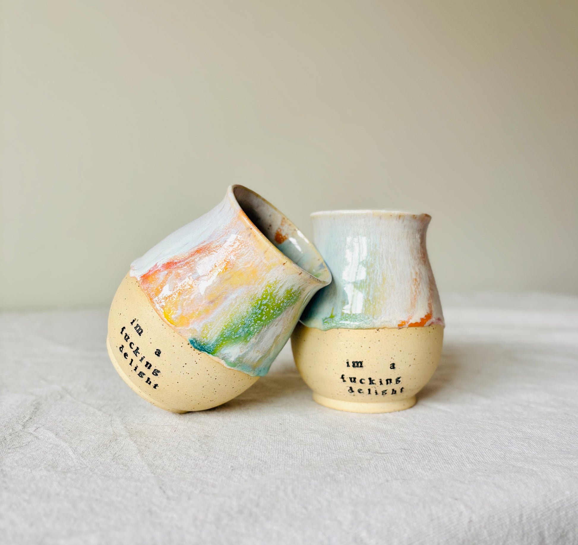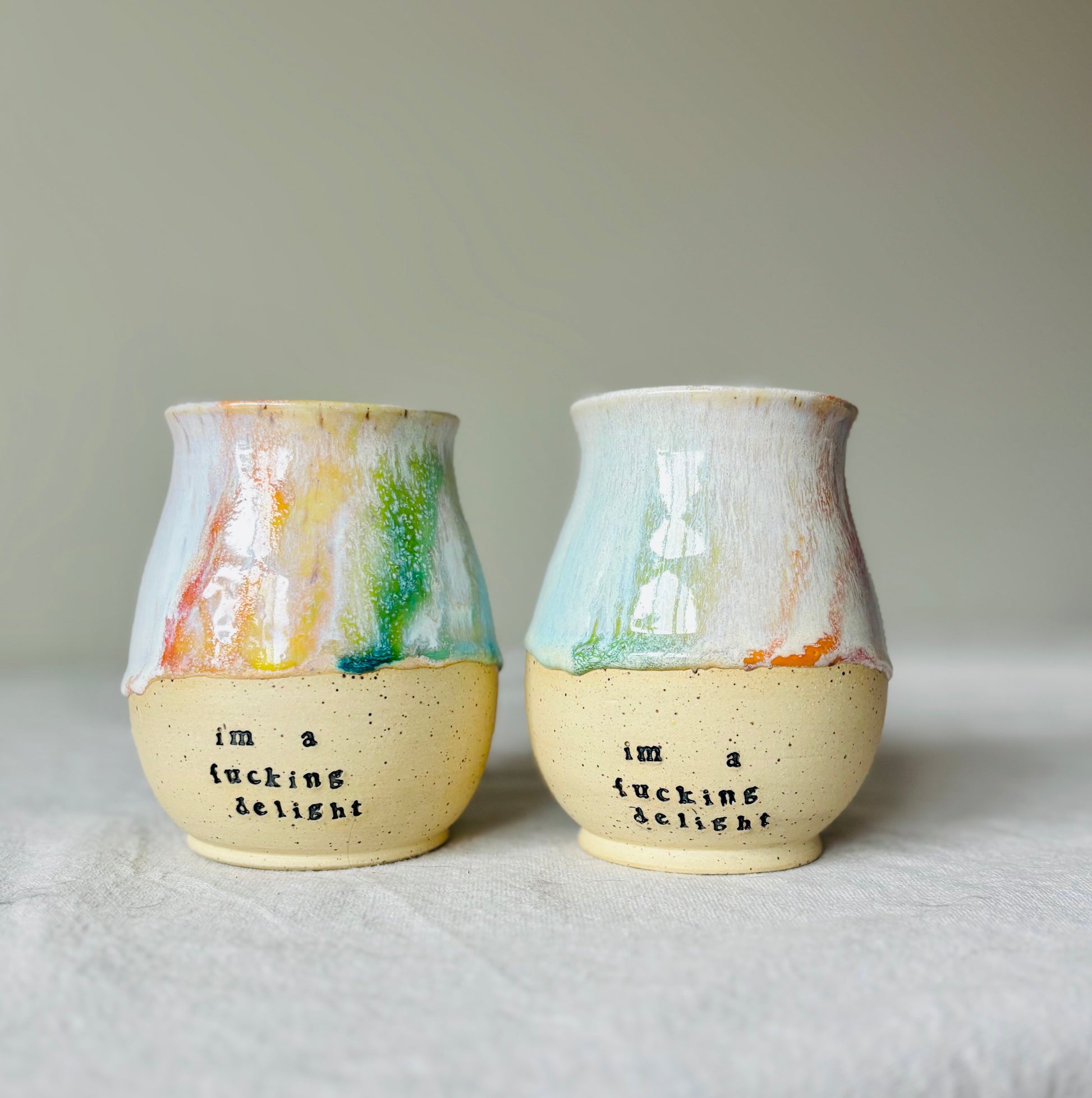 This is a pre-order for a wheel thrown “I’m a Fucking Delight” mug made out of a speckled cream stoneware and glazed in pastel rainbow.