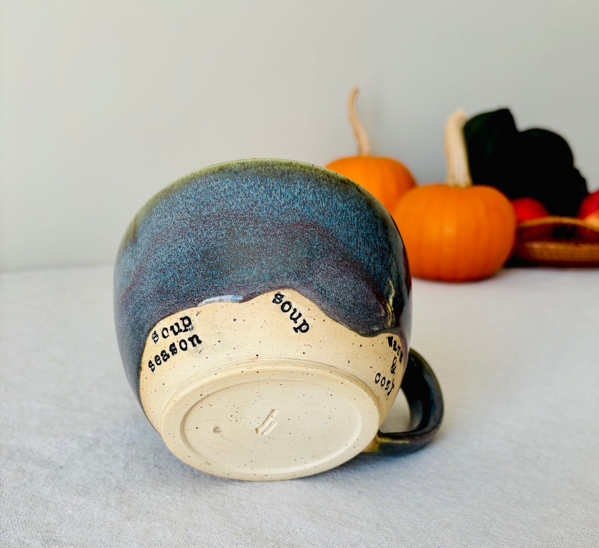 This is a wheel thrown large cappuccino OR soup mug made out of a speckled cream stoneware and glazed in a moody turquoise that cascades into a darker plum toward the bottom. Cute phrases about soup and autumn were stamped into the clay and inlaid with black underglaze.